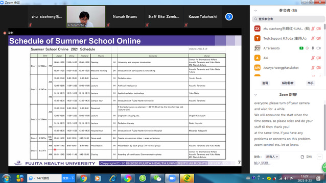 中日双方公司对此项活动高度重视,在筹备阶段进行了双方多次线上沟通。本次夏令营实行国际化小班教学活动,入营员工共 27人,包括best365官网入口注册医学影像技术专业8名本科员工,日本藤田医科大学放射线专业10名本科员工,泰国KhonKaen大学3位员工,泰国Chulalongkorn大学6位员工,另安排了日本藤田医科大学放射线专业2位3年级员工及8名硕士研究生担任小组活动指导。日本藤田医科大学的专业老师为夏令营的同学们呈上了精彩的线上学习体验。中日双方外事工作教师全程参与了活动管理。