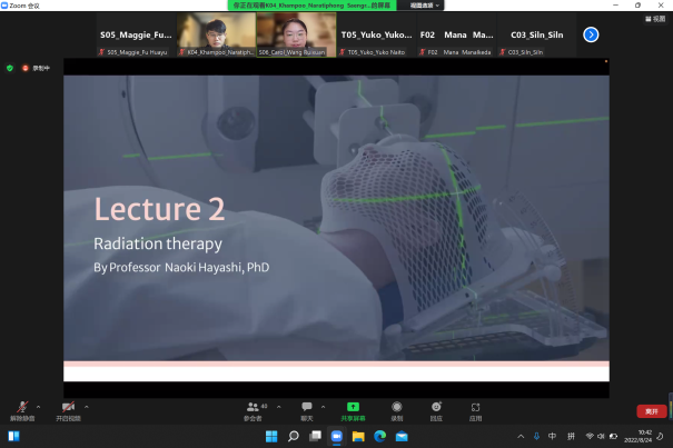 本次夏令营中,邀请了日本藤田医科大学放射线专业教师开展多场学术讲座,包括AI的背景与基础及其在医学中的应用、放射治疗的基本原理、放射技术临床应用、核医学技术、乳腺癌治疗技术等内容;另外,还特别邀请到了来自日本九州大学的教授为营员们开展虚拟现实技术在医疗放射领域的应用讲座。期间,进行了小组活动讨论、作业提交、答疑、发表会、点评等多项活动,并进行了校园以及附属医院放射科线上参观。